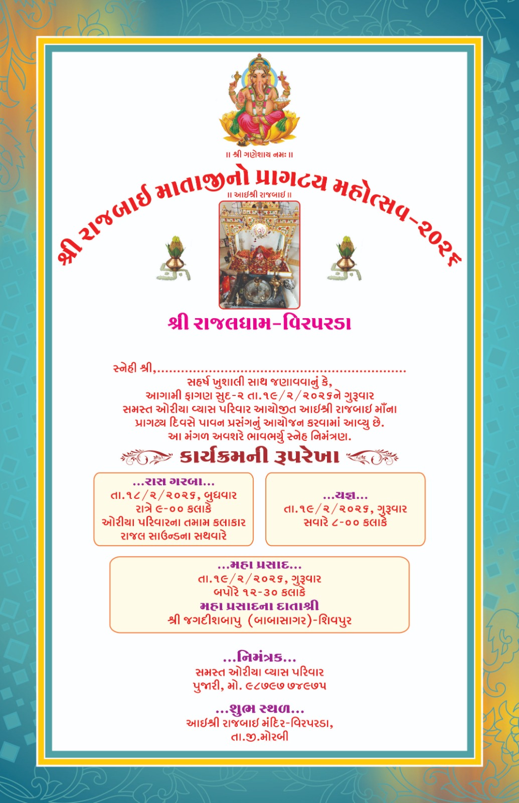 સ્થળ: આઈશ્રી રાજબાઈ મંદિર, વિરપરડા, તા. જી. મોરબી. સમસ્ત ઓરીયા વ્યાસ પરિવાર અને મંદિરના પુજારી દ્વારા આ ધાર્મિક અવસરે પધારવા તમામ ધર્મપ્રેમી જનતાને ભાવભર્યું નિમંત્રણ પાઠવવામાં આવ્યું છે. વધુ વિગત માટે મોબાઈલ નંબર ૯૮૭૯૭ ૭૪૯૭૫ પર સંપર્ક કરી શકાશે.