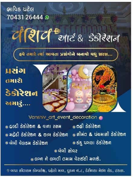 (પ્રમોશનલ આર્ટીકલ) ટંકારા; હાલ લગ્નની સીઝન ચાલી રહી છે ત્યારે સૌવ કોઈ પોતાના પ્રસંગને યાદગાર બનાવવા માટે મથામણ કરતા હોય છે. પરંતુ લોકો પ્રસંગના ડેકોરેશન બાબતે ચિંતિત હોય છે કેમકે આજે મન ગમતું ડેકોરેશન કોઈ કરી આપતું નથી તો હવે તમારે તમારા કોઈપણ પ્રસંગે ડેકોરેશનની ચિંતા કરવાની જરૂર નથી કેમકે ટંકારામા વંશિવ આર્ટ ઇવેન્ટ ડેકોરેશન હવે આપના પ્રસંગમાં લગાવશે ચાર ચાંદ તમારા પ્રસંગને વંશિવ આર્ટ & ડેકોરેશન સાથે બનાવો વધું સરસ તો રાહ શેની જુઓ છો આજે જ સંપર્ક કરો વંશિવ આર્ટ & ડેકોરેશનનો.